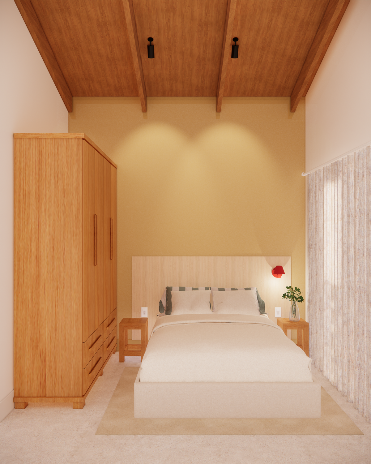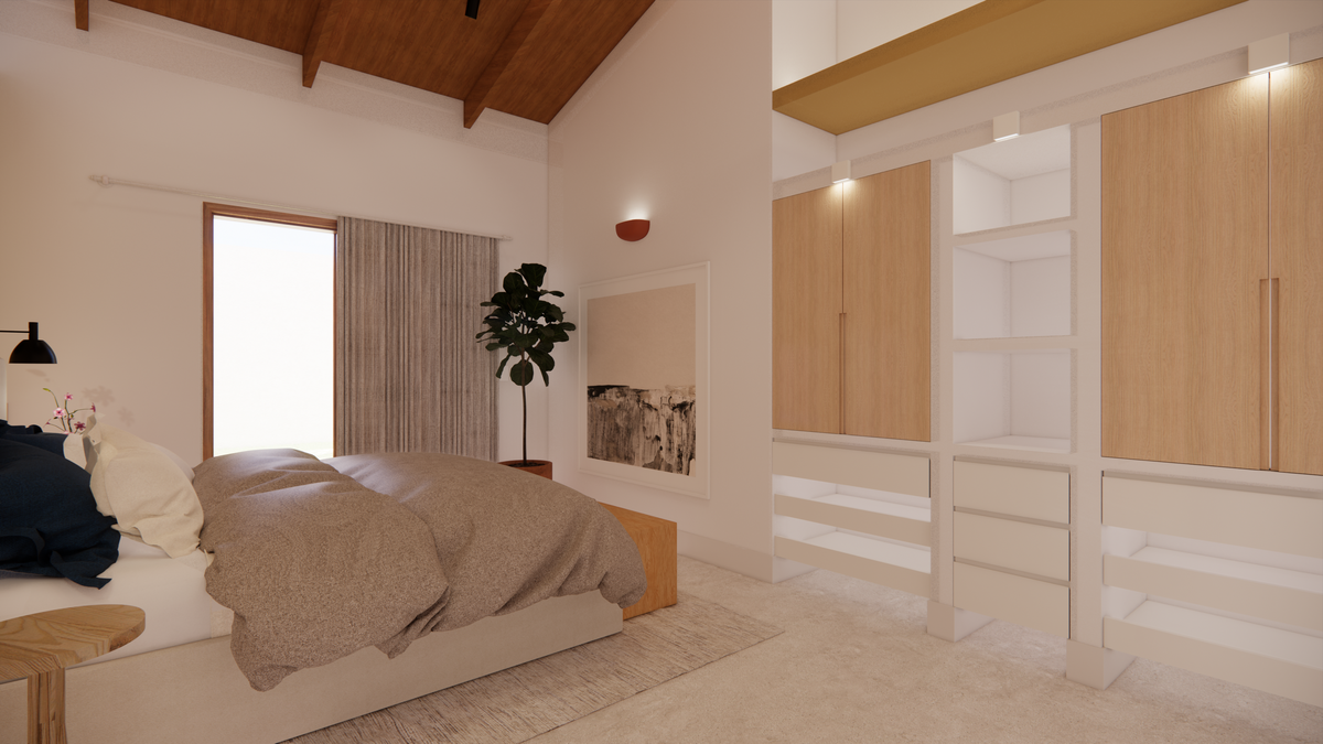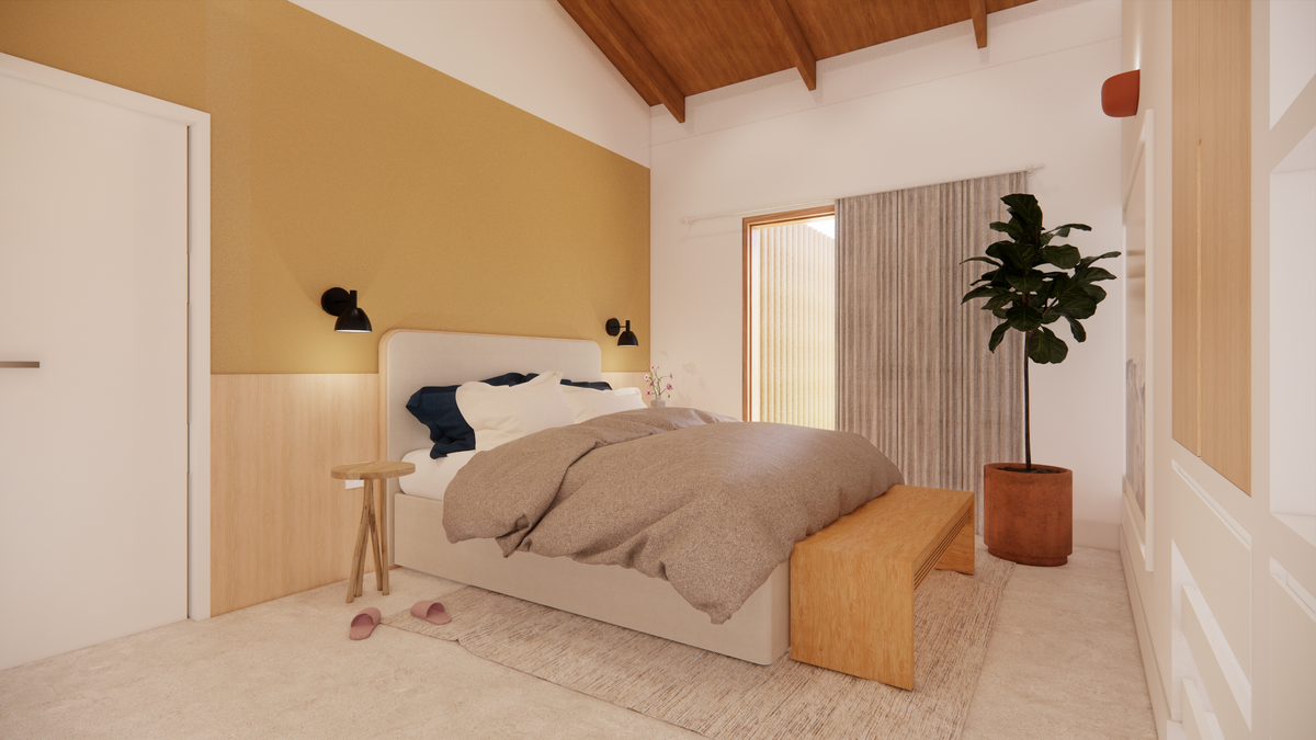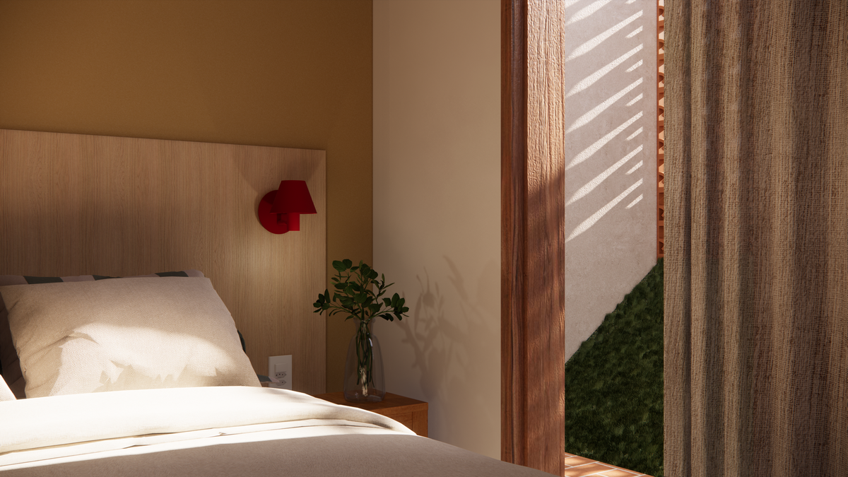 A materialidade da casa reflete o repertório afetivo e brasileiro do casal. O piso de cimento queimado percorre toda a residência, enquanto os revestimentos porcelânicos aparecem pontualmente na cozinha e nos banheiros. Nos quartos, o protagonismo é da cor “Cachorro Caramelo”, da Suvinil — escolhida tanto pelo nome quanto pelo tom de amarelo queimado que evoca a luz do sol e aquece o ambiente. Outro destaque é a estrutura do telhado aparente, que se integra ao forro amadeirado e reforça o caráter acolhedor da casa.