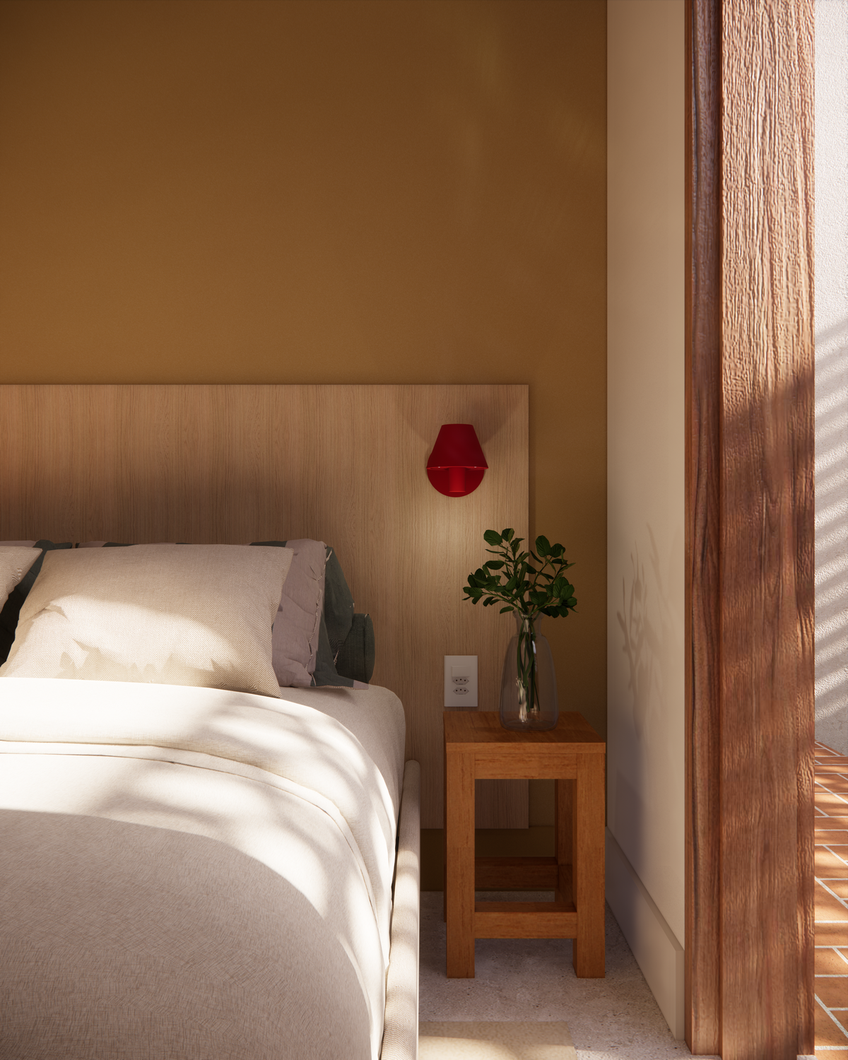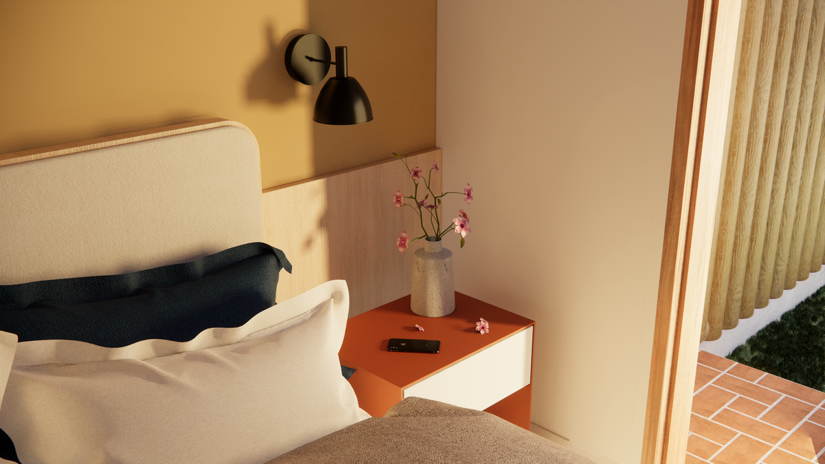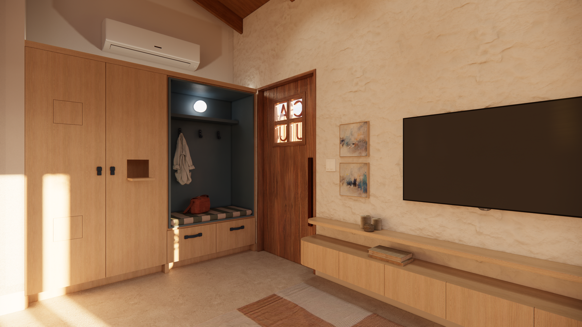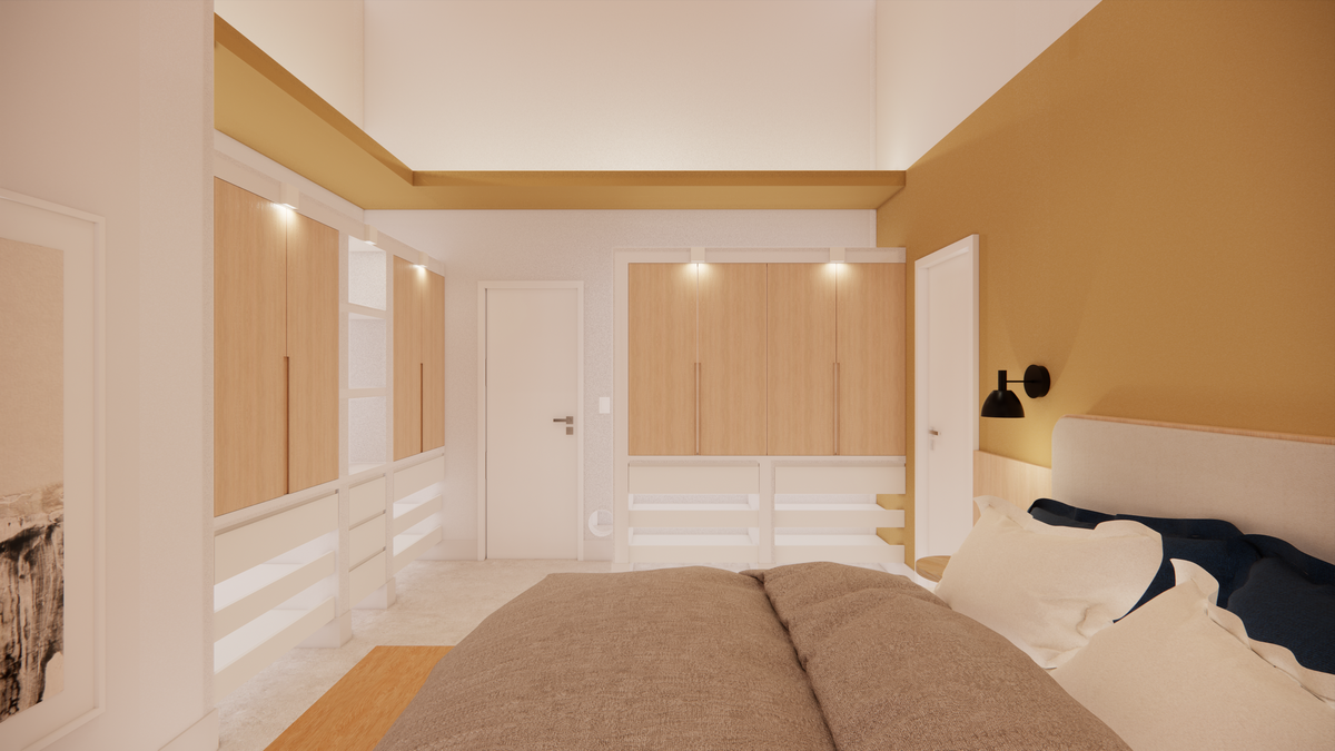 A materialidade da casa reflete o repertório afetivo e brasileiro do casal. O piso de cimento queimado percorre toda a residência, enquanto os revestimentos porcelânicos aparecem pontualmente na cozinha e nos banheiros. Nos quartos, o protagonismo é da cor “Cachorro Caramelo”, da Suvinil — escolhida tanto pelo nome quanto pelo tom de amarelo queimado que evoca a luz do sol e aquece o ambiente. Outro destaque é a estrutura do telhado aparente, que se integra ao forro amadeirado e reforça o caráter acolhedor da casa.