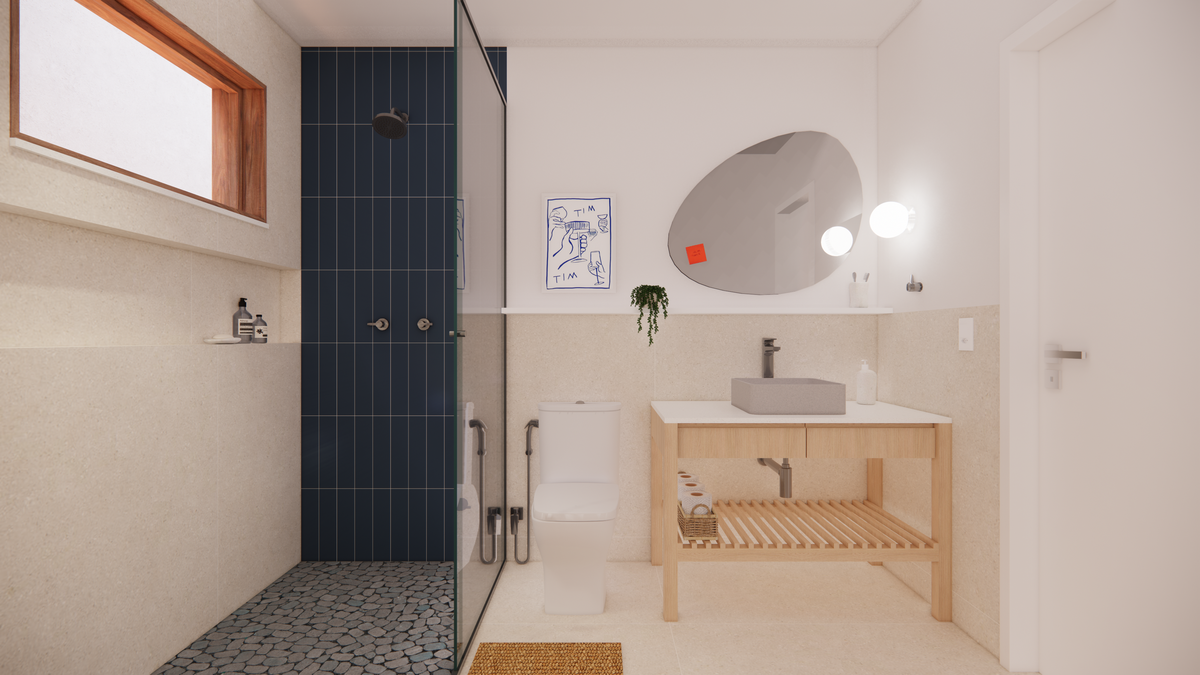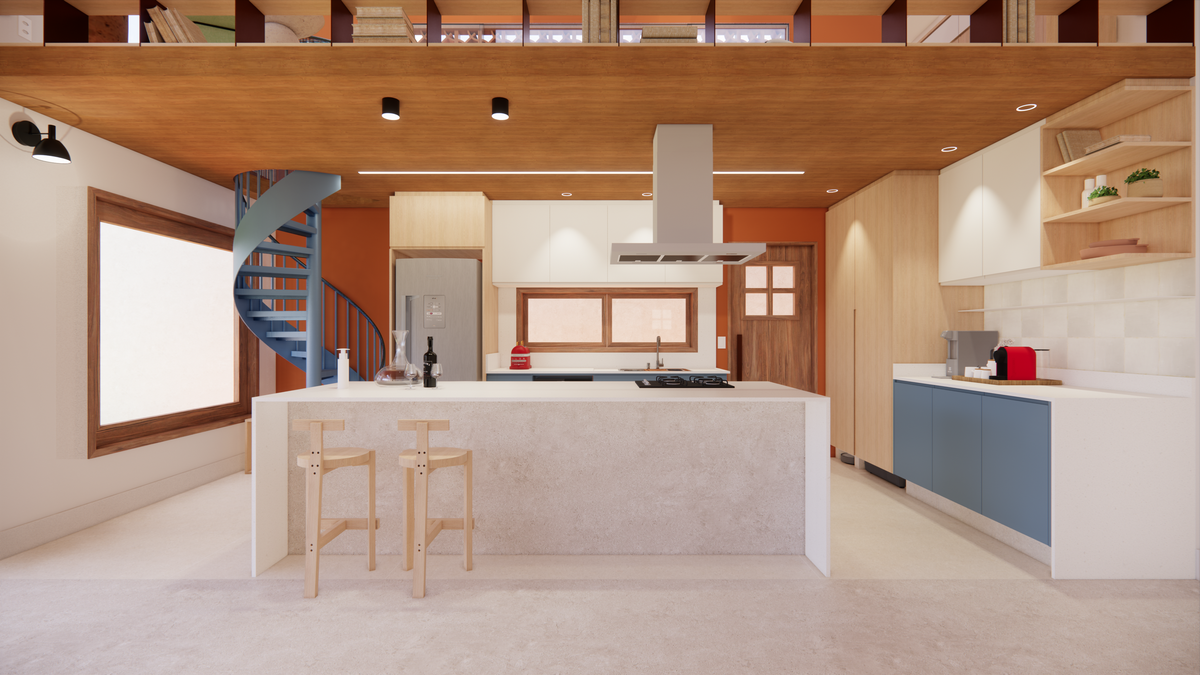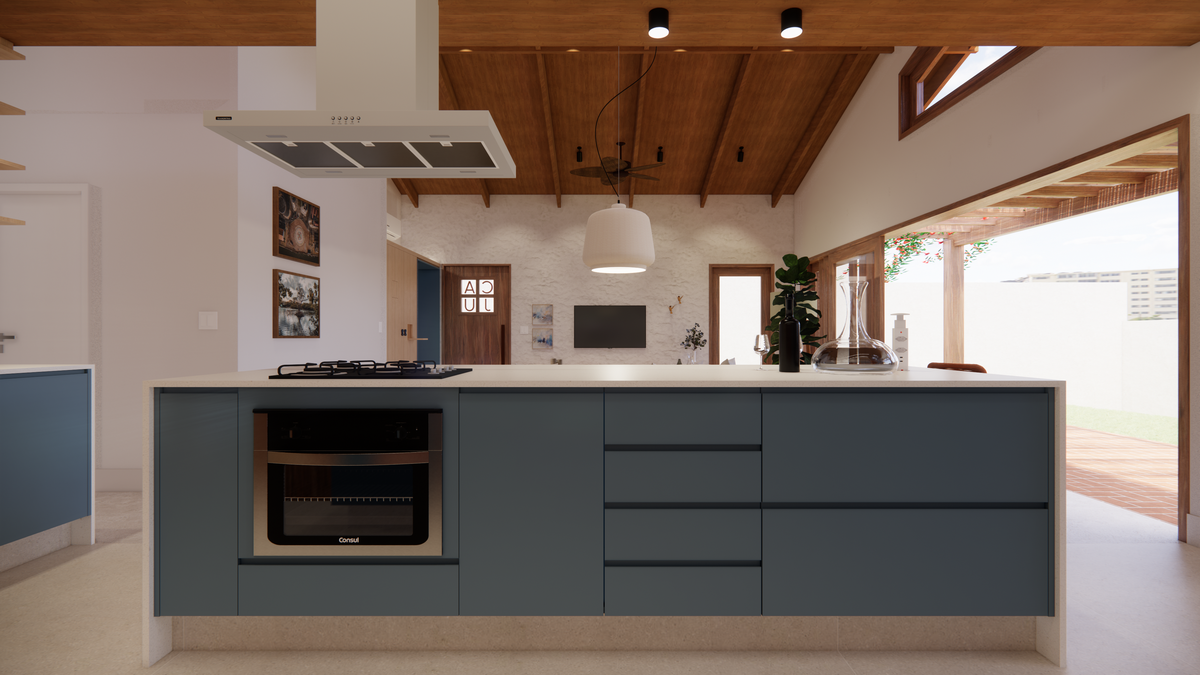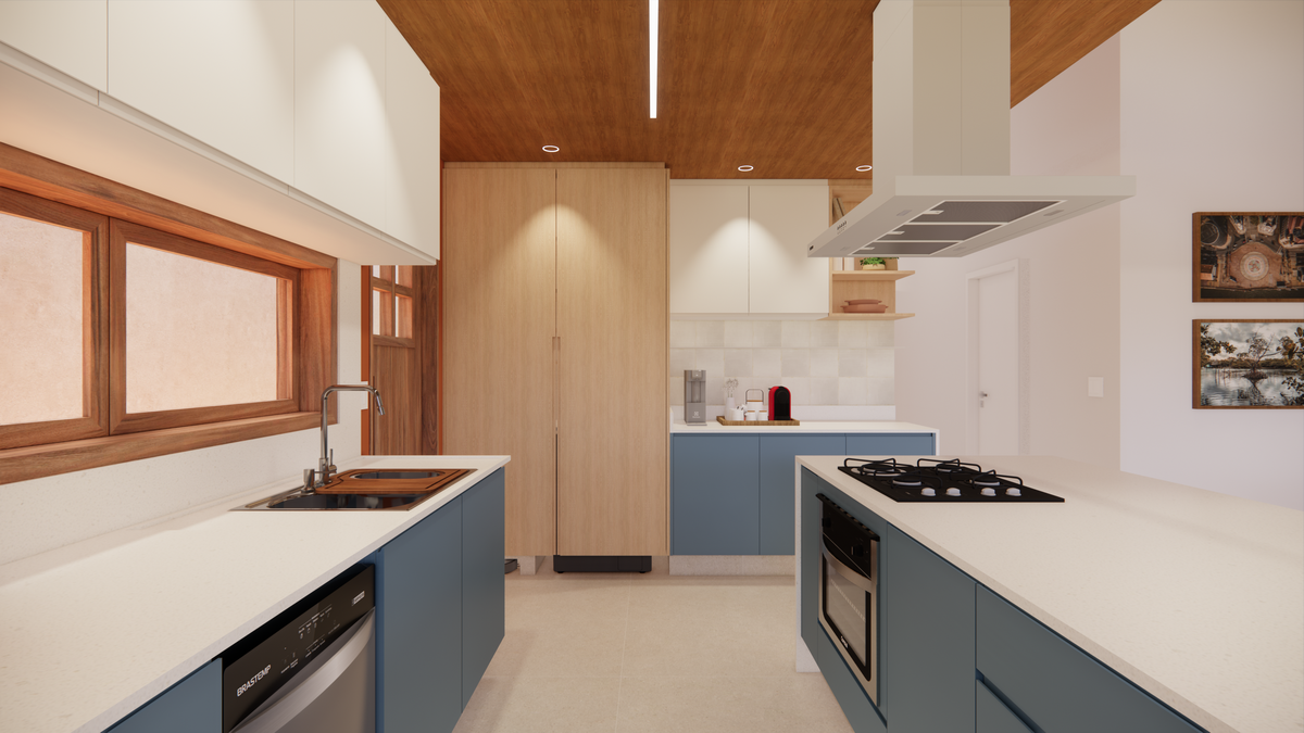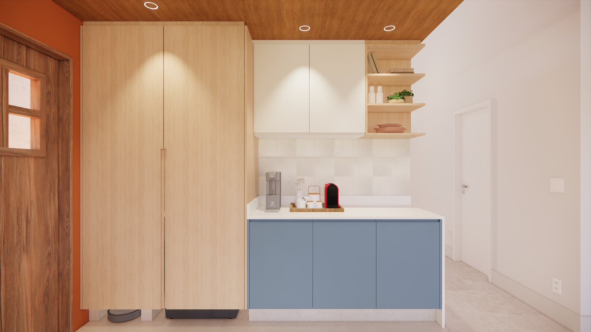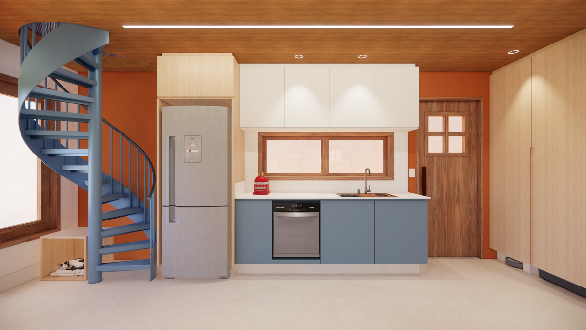 A cozinha se destaca pela ilha central multifuncional, projetada para abrigar tanto os eletrodomésticos aparentes — forno e cooktop — quanto os ocultos, como forno de pizza, micro-ondas e airfryer. O fundo da cozinha recebe o tom “Marmelada”, da Suvinil, em contraste com o “Azul Profundo”, da Duratex. As banquetas Girafa, desenhadas por Lina Bo Bardi e produzidas pela Marcenaria Baraúna, arrematam o conjunto com leveza. Como solução prática e discreta, projetamos a lavanderia oculta em um armário: um espaço funcional multiuso, que serve de apoio para despensa, com máquina de lavar, bancada e prateleiras.